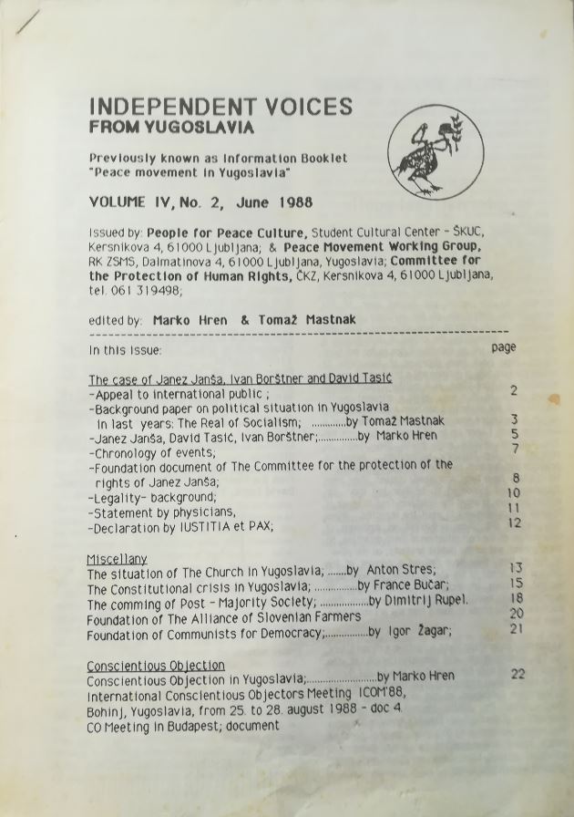 Čezmejna solidarnost in globalno omreževanje s progresivnimi gibanji je bilo v središču aktivnosti slovenskega mirovnega gibanja. Tedaj so bili objavljani in na široko distribuirani redni informativni bilteni v angleščini, kakor da bi se poslalo močno sporočilo mednarodni skupnosti, in sicer, da je gibanje posvečeno vrednotam globalne solidarnosti, nenasilnega delovanja in mirnega reševanja konfliktov. Zaradi tega so opozicijske politične skupine, ki so se v Sloveniji pojavile ob koncu leta 1988, zaupale mirovnemu gibanju promocijo slovenske pomladi v tujini. Mirovno gibanje je bilo prva organizacija, ki je v tujini objavljala novice o demokratičnih gibanjih in organizirala prve politične misije v tujini. Bila je tudi ključna v promoviranju pravic četverice opozicijskih vodij, ki so bili pripeljani pred vojaško sodišče leta 1988 (Janša, Borštner, Tasič in Zavrl), kar je povzročilo masovne demonstracije in upor zoper jugoslovanski režim, v končni fazi pa je pripeljalo tudi do neodvisnosti Slovenije.